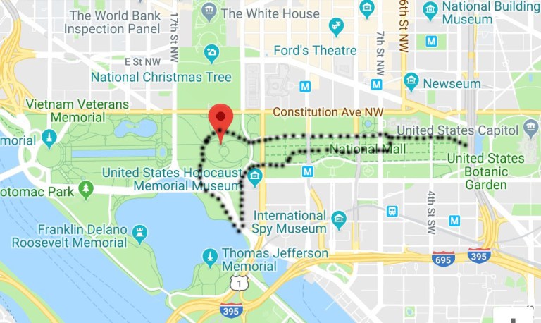 Here’s a map of my walk around the mall. Starting in front of the capitol building, going down to the Washington Monument, over to the Thomas Jefferson Memorial, back past the Holocaust Memorial, and back into the mall area, and back to my car.