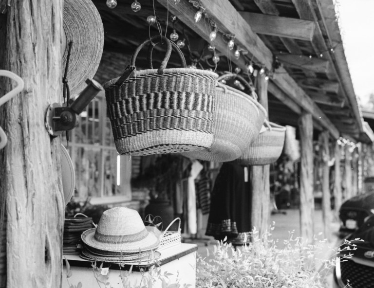 So, I processed these using my Lab-Box – and it was my first time using it. Well, I loaded the film wrong and several exposures were lost due to the film touching in several spots. These 5 did develop correctly (except the first one, which was cut off slightly on the bottom, and the hat appears to have a defect). I think I like the one of baskets hanging best.