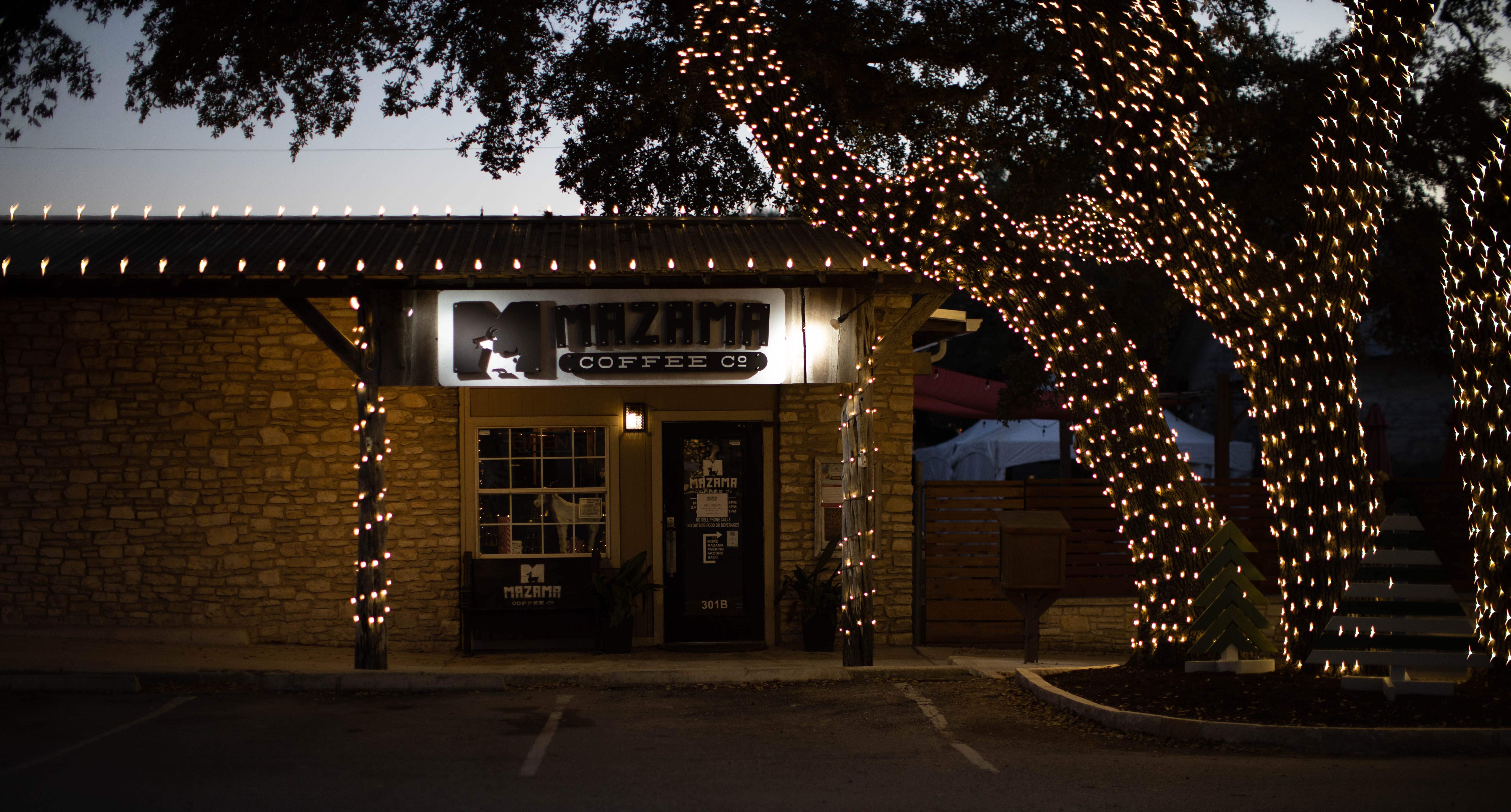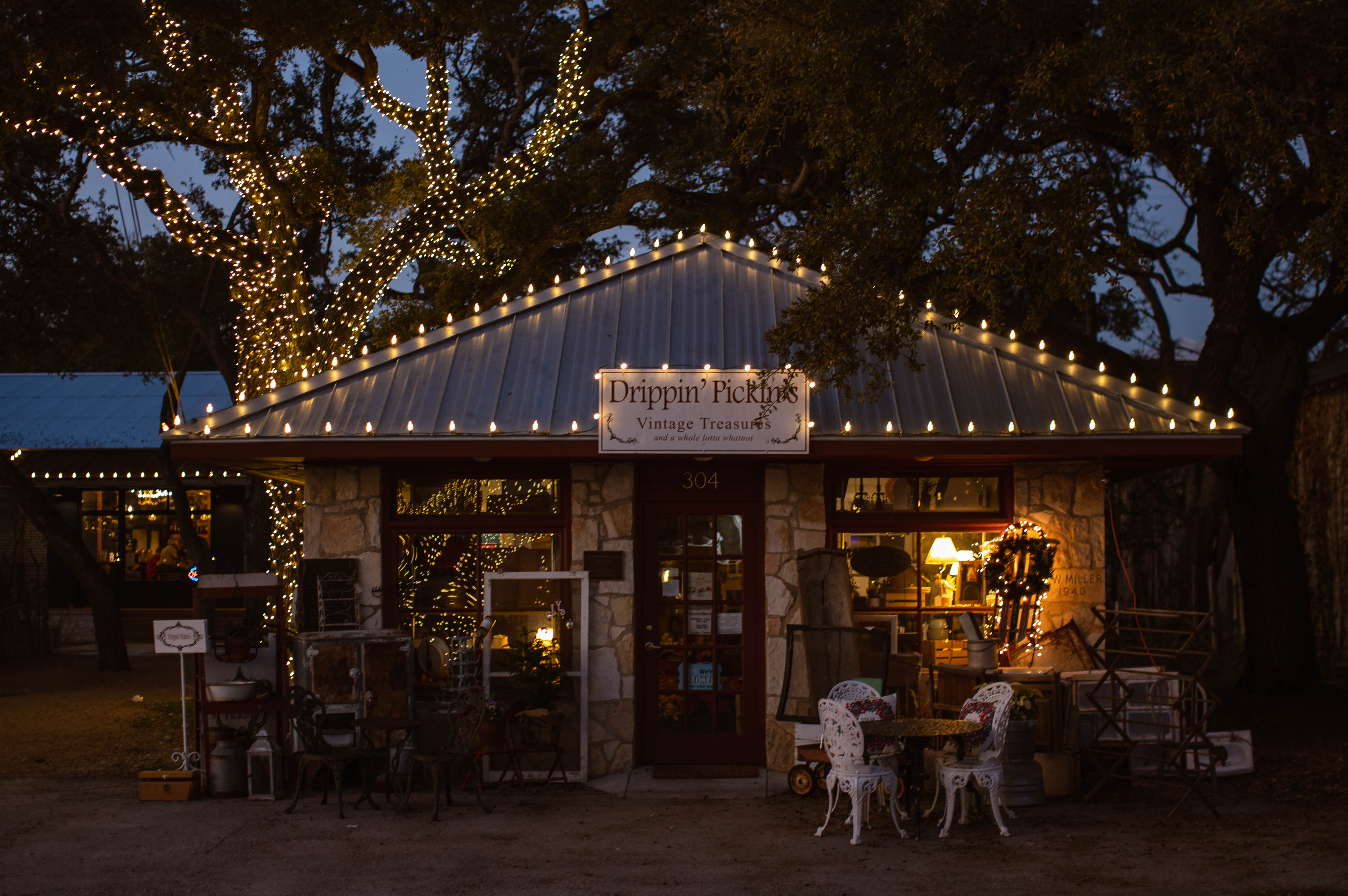 Here are a few photos of lights on buildings and trees in my little town of Dripping Springs. Notice the complete lack of snow… the image at the top of this post is of a wonderful sunset I saw behind our town Christmas tree – taken with my phone on my way home last Friday.