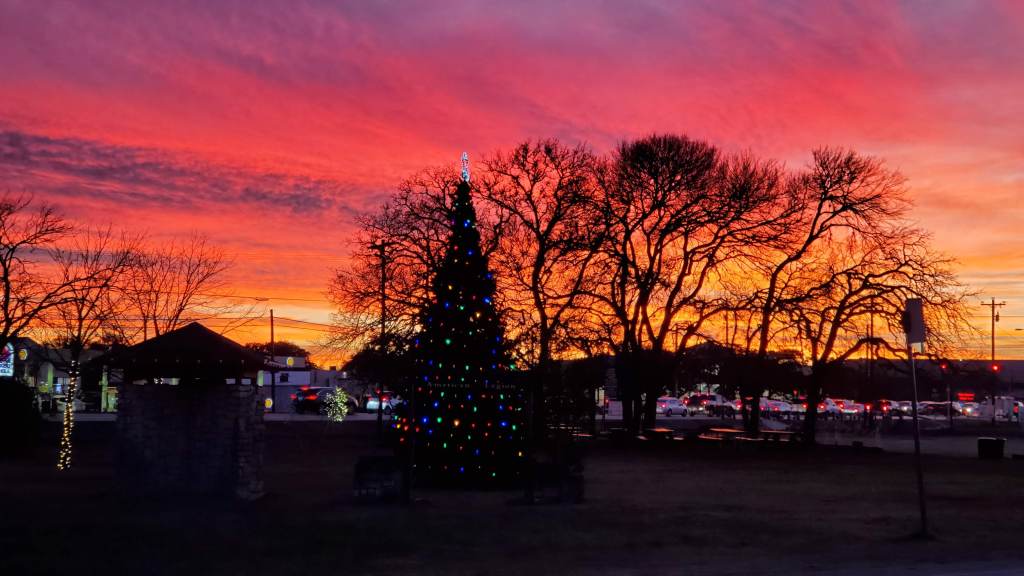 Here are a few photos of lights on buildings and trees in my little town of Dripping Springs. Notice the complete lack of snow… the image at the top of this post is of a wonderful sunset I saw behind our town Christmas tree – taken with my phone on my way home last Friday.