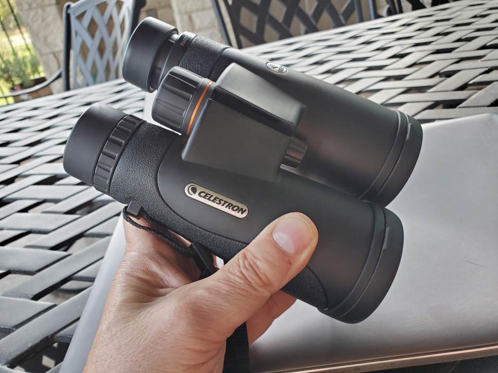 Both Celestron binoculars I’m evaluating are very good, and I like them a lot. This particular model is light, and relatively small, even though it’s a 42mm lens diameter. This 8x model provides a good, bright image – like what I’d expect from a 42mm lens (compared to the 32), plus it includes adjustable eye cups, so if you don’t wear glasses (like me) you can adjust the eye cups up a bit so your eyeball isn’t too close to the lens. All the models I tested here have a similar feature. I like this one because the eye cups feel solid when you adjust them. The diopter adjustment is easy to adjust, but I’d like the adjustment dial a bit looser. Being tight will keep it from changing, but for someone with smaller fingers, like my wife, it may take quite a bit of effort to adjust. Thankfully, once it’s adjusted, you shouldn’t have to move it again.