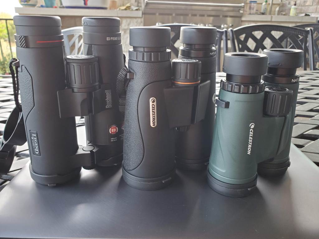 This is a very tough decision. All come with a tri-pod mount, lens caps, case, and strap. Which one is best? Well, for me, I like the Bushnell. It is a little large, so that may eliminate the two larger binoculars all together. If size and weight isn’t a huge factor, I’d definitely consider either the Bushnell Legend M-Series 10×42, or the Celestron Nature DX ED 12×50. If you need something a little smaller, I recommend the Celestron Nature DX 8×42. It’s light, while still providing a bright, clear image. If you need to go smaller, to a 32mm lens, I think you’ll probably have to look at ED glass and/or Die-Electric prism coatings to get a bright enough image.