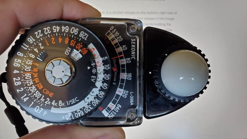 When I’m using the C330, I always check lighting and set the exposure first. For checking light, I use my Sekonic Studio Deluxe. This meter isn’t as sensitive in low light because it’s solar powered, and doesn’t require a battery. That’s very convenient for me – and since I’m generally not using these cameras at night, or under other very low light conditions, the Studio Deluxe works well. You can see, in the image below, it’s not too complex, and pretty easy to read and use. One of the main reasons I continue to use my Studio Deluxe is because that’s what I used in college, and I’m very comfortable using it.