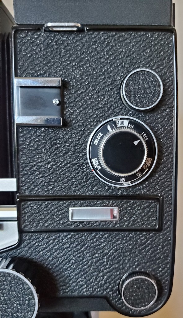 On the left side of the camera (on the same dial that I mentioned before, where you can set your ASA/ISO) there is a “Lock/Unlock” dial. This is an interesting feature – which allows for closing off the film box so the lens can be changed with film in the camera. It also controls the lock on the lens retaining bar – so, when it’s locked, the lens cannot be removed. When it’s unlocked, a wall moves up inside the camera (between the film and the lens, effectively forming a light-tight covering for the film) and, simultaneously, the lock is removed from the lens retaining bar. Then the lens may be removed. Remember, the shutter on these cameras is in the lens. So removing the lens without this feature would result in light shining directly on your film.