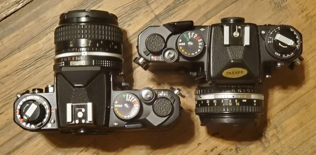 Cosmetically, the cameras are very similar. I have black models, but they both come in either all black or silver/black finishes. I’m not sure which I like better – but mine are both very clean, except for one small dent on the shutter speed dial of my FE2. Not a big deal, and it doesn’t impact performance or function at all. You can see the dent below – barely noticeable, on my FE2 (left). My FE is fitted with a 50mm f/1.8 lens, and the FE2 has a 28mm f/3.5 lens mounted.