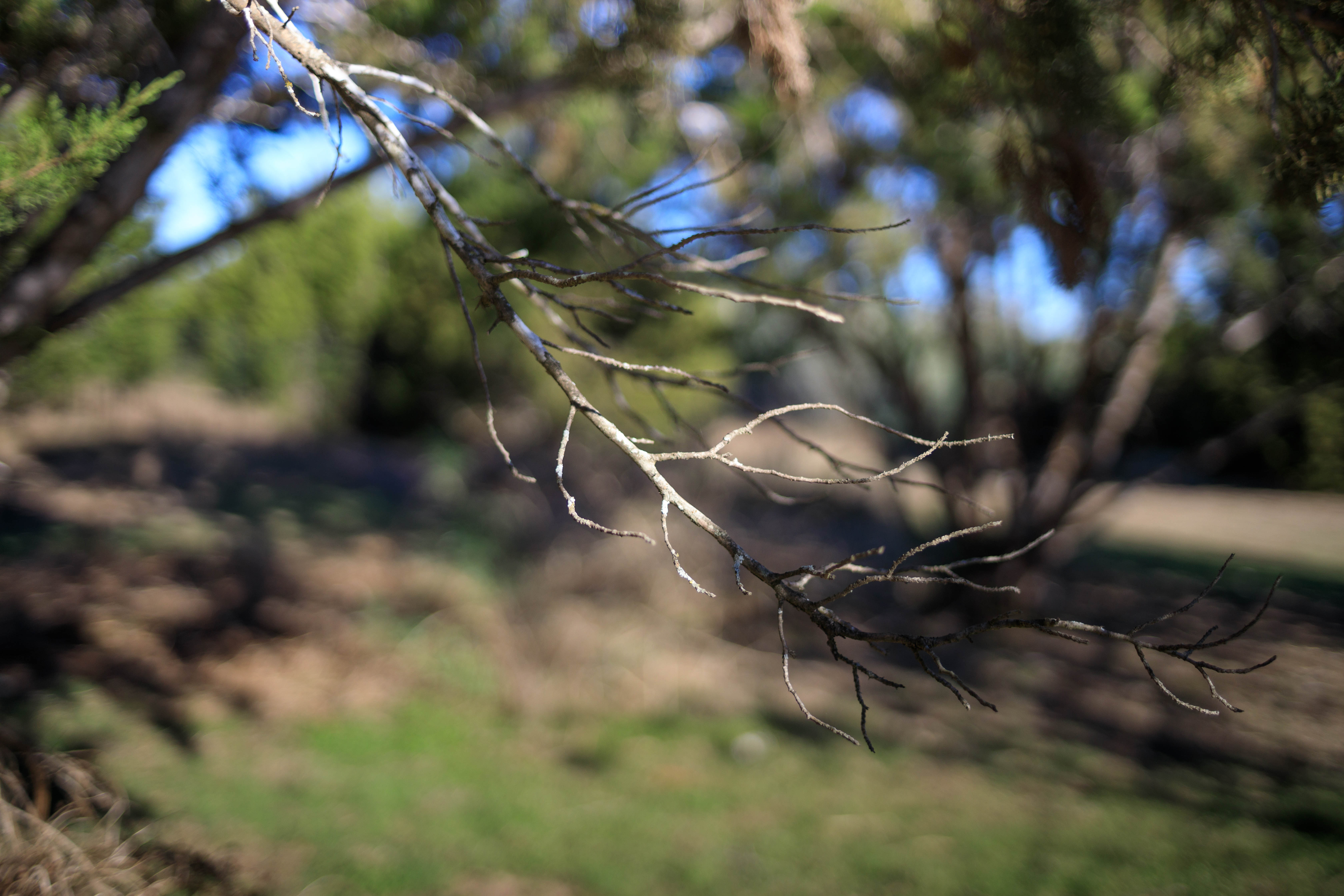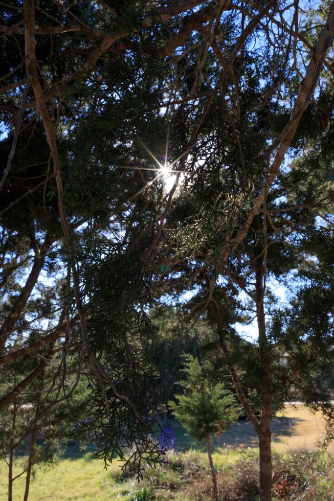 In the image above, I stopped down to f/22 and photographed the same tree branches, looking into the sun. The result is a nice, 8-point star, with some tiny spots of flare toward the bottom of the photo, but very minimal.