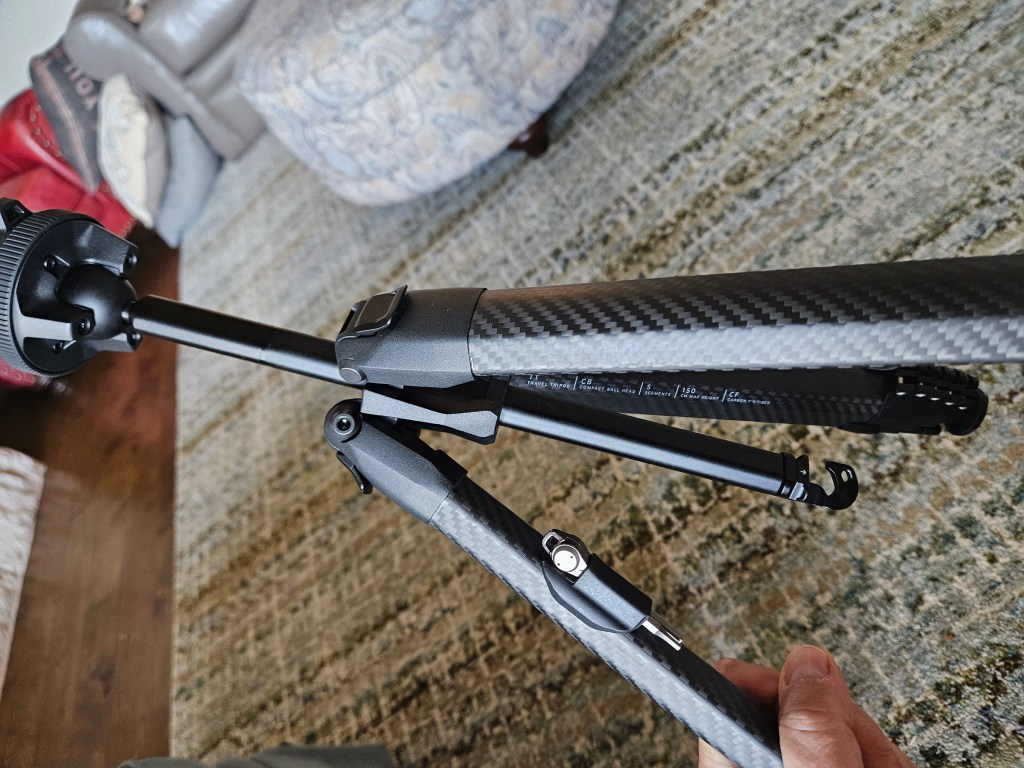 The carbon fiber version (which is what I am trying) feels solid even with the legs extended all the way, although I wouldn’t extend the last section of leg when using my Hasselblad and waist level finder. If I were using the DSLR or Mirrorless camera, it would be just about eye level completely extended. I measured it at about 60″ from ground to the ball head. The last extension of the legs (the 5th section) is very thin – however, it feels strong enough, and I would use it for normal shots. If I were doing long time exposures on a windy day, I might not extend it all the way with the last section of leg. I’m not sure how that might work in heavy wind – even with a weight – but, again, this is not my main concern for this tripod. If you need extra stability, I might not extend all the way.